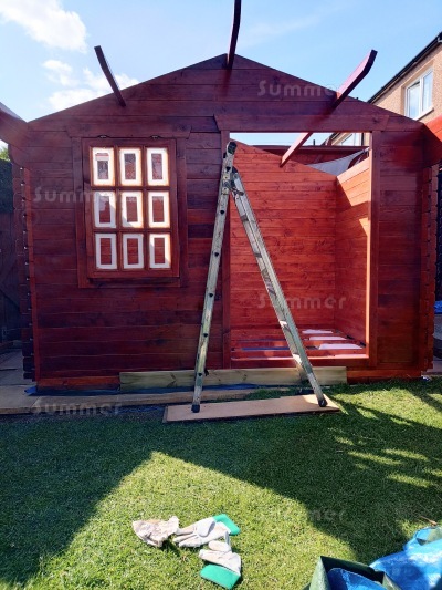 When we received our initial phone call after ordering, the nice man I spoke to did say that you rarely receive updates or photos of completed cabin by customers so we received our order from you a couple of weeks ago and thought you might like to see how 2 disabled OAPs (in our 60's) have got on so far with our Apex 28mm Log Cabin 881 (keep in mind this is Scotland and we do not get the weather very often here to start building outdoors).
