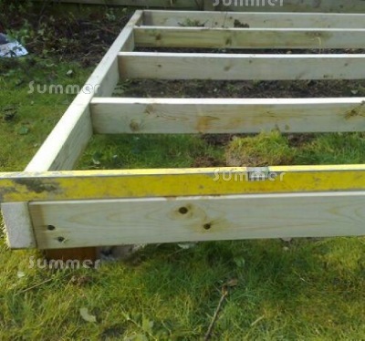A pressure treated timber platform base is suitable for any building with a timber floor, especially at a sloping site or a site with made up ground or a recently remoived tree. It is also an option for building without a floor but the platform needs boarding over, for example with decking. The substantial timber platform is an ecologically sound alternative to more traditional bases such as slabs or concrete. It can be easily built over sloping or unstable ground without expensive excavation or levelling. The base is made from pressure treated timber bearers and posts. Pressure treatment is a lifetime preservative treatment. The platform should be finished a few inches above the ground allowing for better airflow than other base options. The support posts are concreted into the ground to ensure the base remains flat and level. If you choose quick setting concrete to hold the posts in place you can start installing your new building if you are careful within about half an hour.