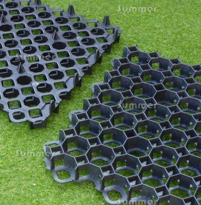 Eco-grids are recommended if the sub-base is soil, sand or pea shingle but not on hard surfaces such as concrete, because the underside is not flat. Integral pegs on the underside help to level the base grids more easily in soil or sand or shingle. Our eco-grid plastic bases can support up to 200 tonnes per square metre. We offer exactly the same eco-grids as driveways and carparks. Gravel or shingle infill is not required below a timber floor. Whatever you store in your building, our eco-grids will support the weight easily. Each eco-grid is 472mm x 472mm and 40mm thick with an immensely strong 60x60mm hexagonal cell structure. Extensive preparation is not normally required - just level the soil and lay the pavers directly on soil or on a thin layer of sand or pea shingle. Any exposed edges around the base can be left unfilled or filled with gravel or shingle.