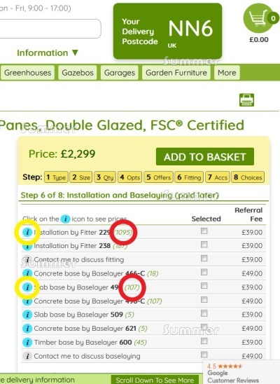 PICTURE: Click on the blue "i" symbols to see fitting and base laying prices (circled in yellow). See how many jobs each fitter or base layer has completed in brackets (circled in red).